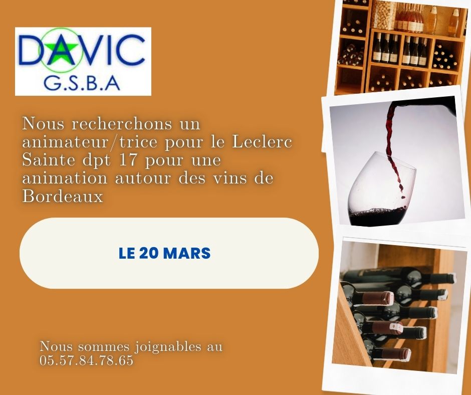 Nous recherchons un animateur / trice pour une Animation autour des vins de BordeauxLeclerc Saintes dept 17
